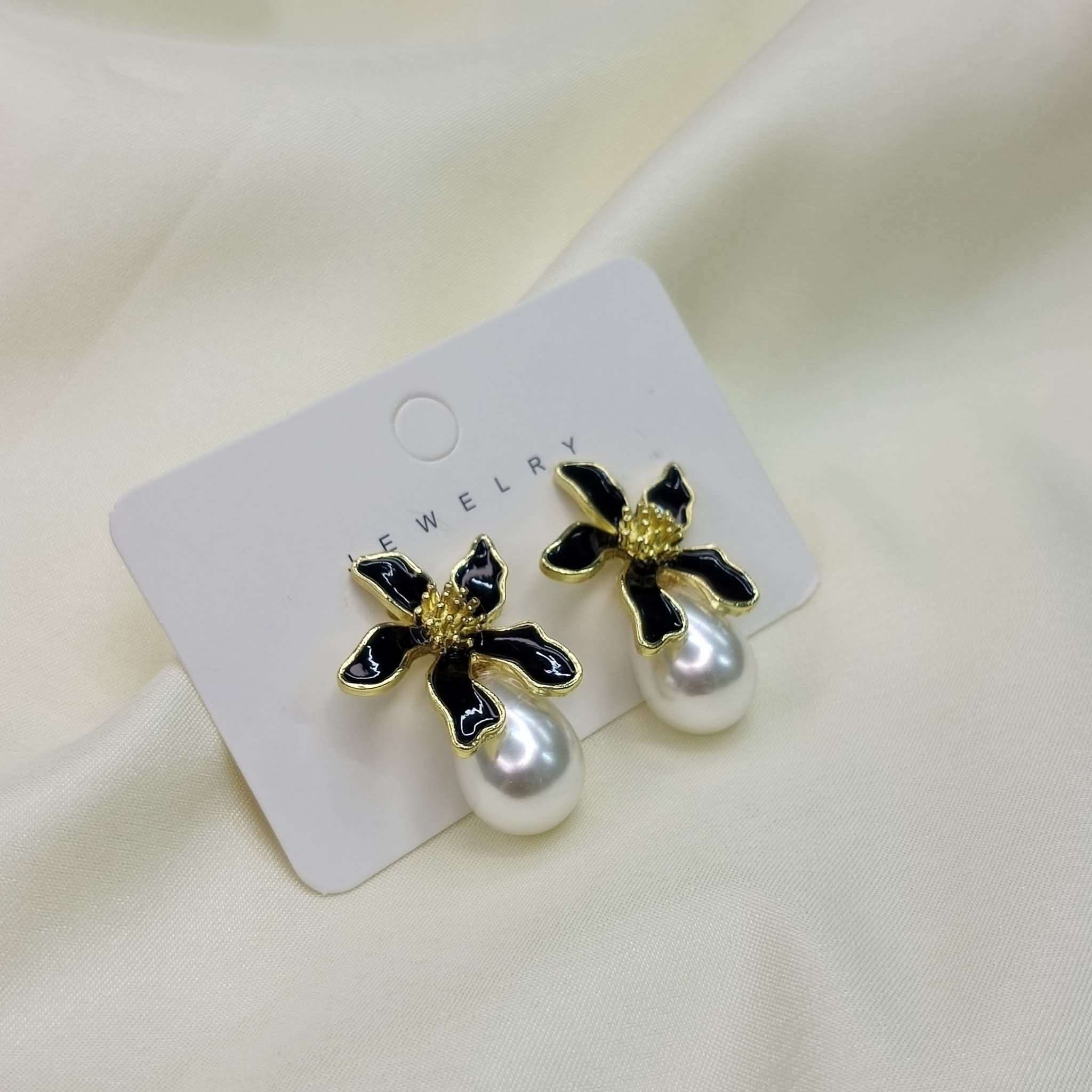 Black flower pearly rhinestone earrings